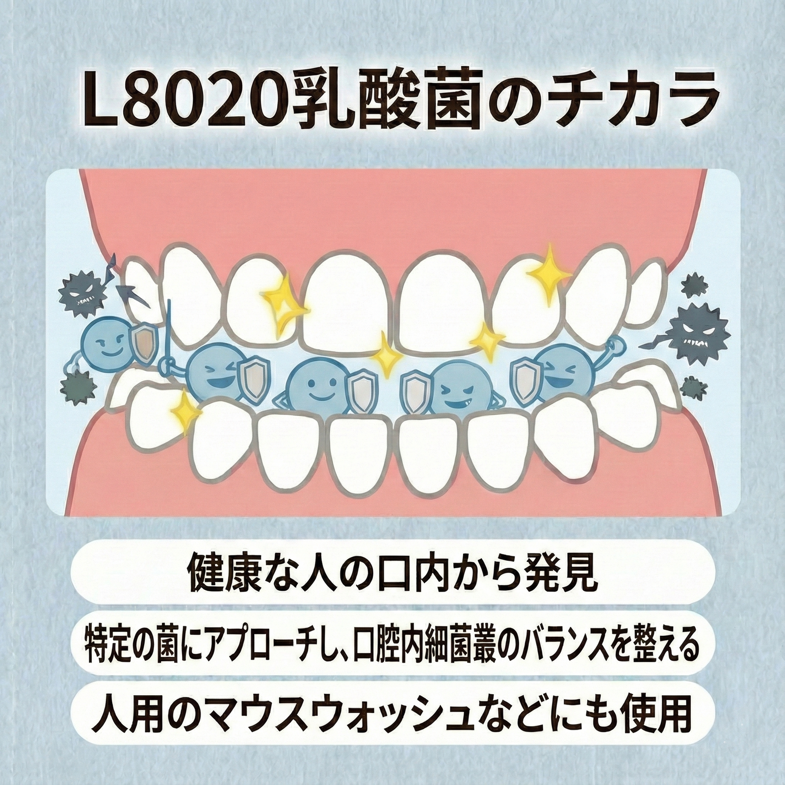 この乳酸菌の代謝産物が、お口の中の特定の菌にアプローチし、口腔内環境を健康に保ちます。